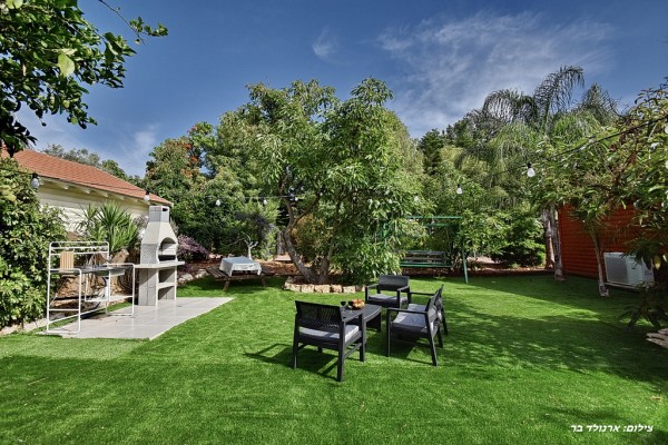 | נדנדת חצר, דשא לגינה, מנגל - B.B.Q, תאורת חצר, ריהוט בגינה, עצים ירוקים, שלל פרחים, ערסלי חצר, ספסלי גינה.