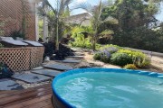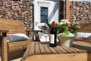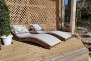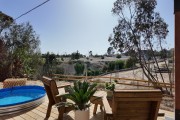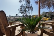 | מיטות שיזוף בגינה, מנגל - B.B.Q, פרגולה במרפסת, תאורת חצר, ריהוט בגינה, גינת צמחי תבלין, עצים ירוקים, שלל פרחים, נוף נראה מפינת הישיבה.